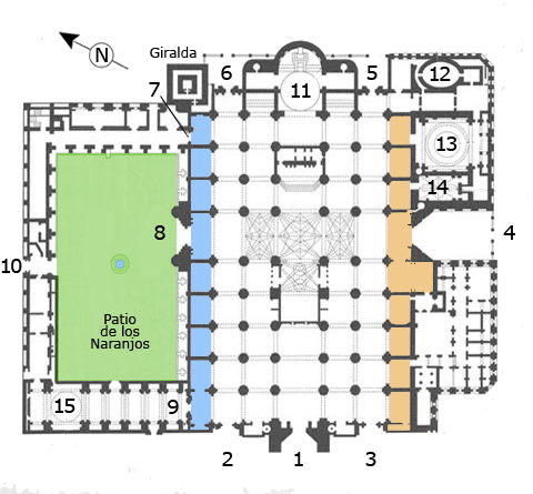 Giralda (7), Capillar Real (11), Kapitelsaal (12), Sakristeien (13, 14), Kolumbus-Tor
