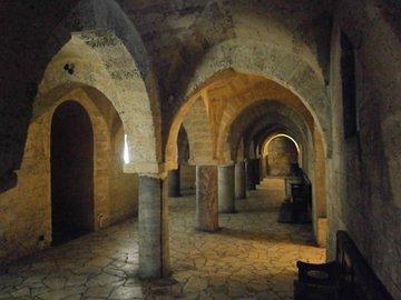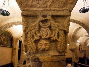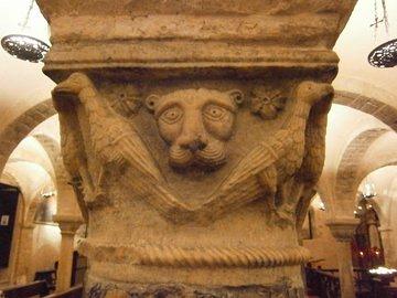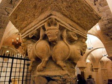 Krypta mit figürlichen Kapitellen (Pfauen und Löwen).