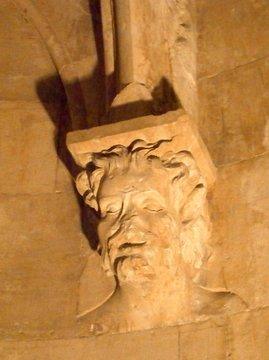 Inneres, Kapitell mit Apostelkopf und Tieren.