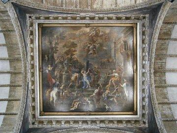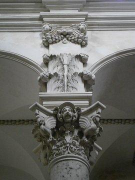 Säulen aus mehrfarbigem Marmor, Nischen und Kamin aus "breccia rossa", Konsolkopf im Gewölbe.