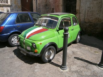 Italienische Symbole: Olivenöl und Fiat 500.