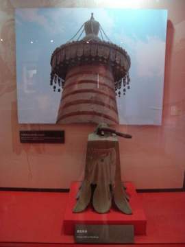 Halterfigur (links), Bronze- und Steinglocken, rechts Musikdarbietung durch die