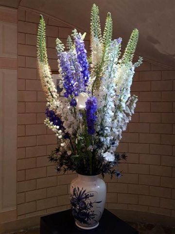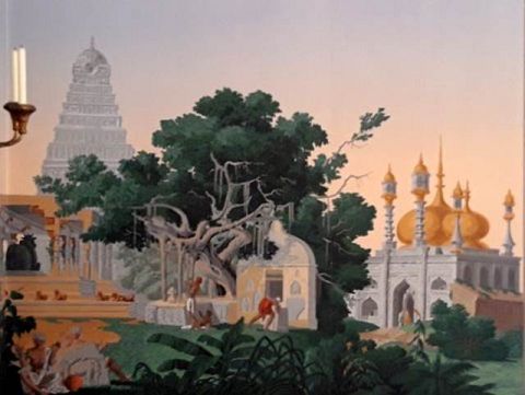Blaue Sitzgarnitur vor indischen Wandmotiven.