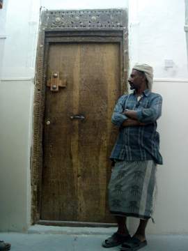 Alte Holztüre im Sultanspalast und imposanter Wächter. Ausblick durch das geschnitzte Fenster. Blick von der Palastterrasse.