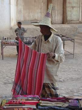 Shibam im Wadi Hadramaut mit bis zu achtstöckigen Häusern (UNESCO-Weltkulturerbe). Tuchverkäufer mit spitzem Strohhut.