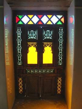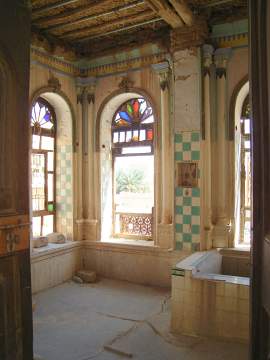 Jugendstil-Zimmer mit Becken (Zimmerbrunnen?). Kunstvoll geschnitzte Fenster.