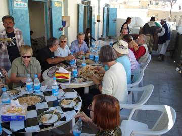 Mittagessen unterwegs mit Fladenbrot, Reis, Gemüse, Fisch oder Hühnchen.