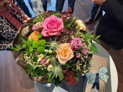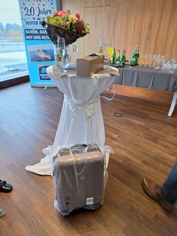 Am Tisch sind bereits die Geschenke hergerichtet: Blumen, Wein, ein Koffer.
