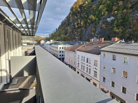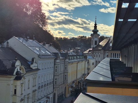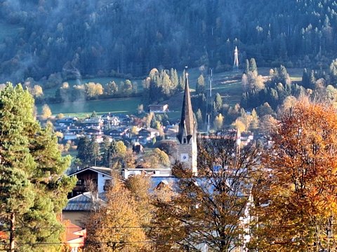 Blick vom Balkon zur Ortsmitte (links der Kirchturm der Katharinenkirche).