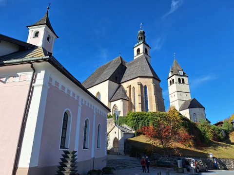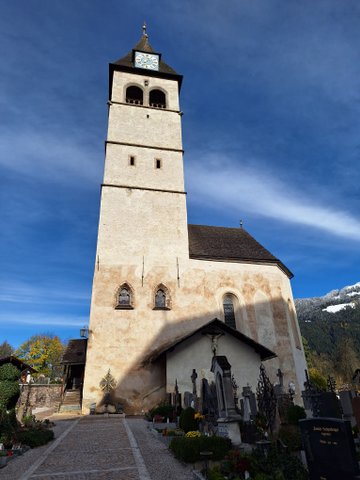 im alten Friedhof, mit mächtigem Glockenturm, dem Wahrzeichen Kitzbühels.