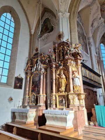 Linke Seitenaltäre (Hl. Sippe u. Altar der Rosenkranz-Bruderschaft).