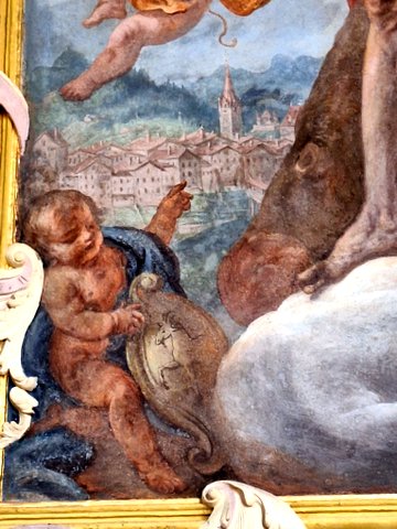 Ausschnitt: Stadtansicht und Putto mit Stadtwappen.