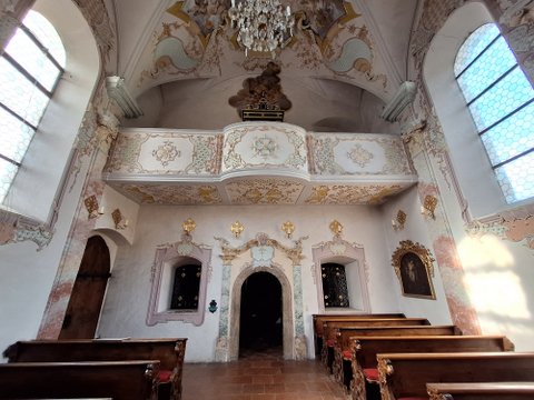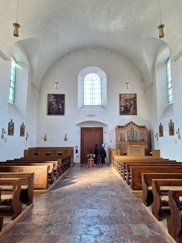 einfacher Saalbau mit Tonnengewölbe, außen kein Turm, nur hölzerner Dachreiter.