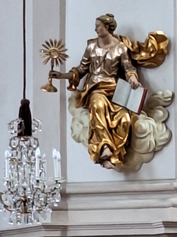 Bewegte Figur auf Wolkenkonsole mit Monstranz und Buch