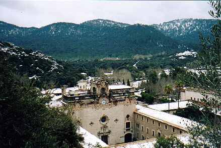 Kloster Lluc im Schnee (mit einer schwarzen Madonna, Kirche von 1691).
