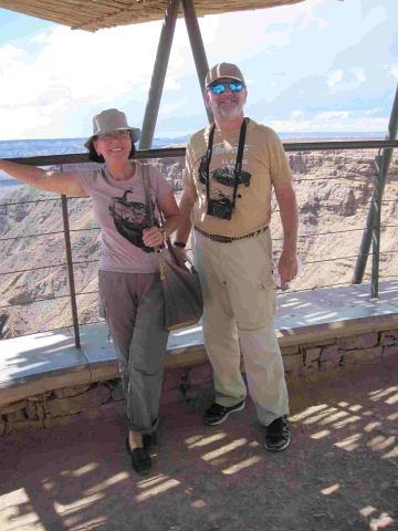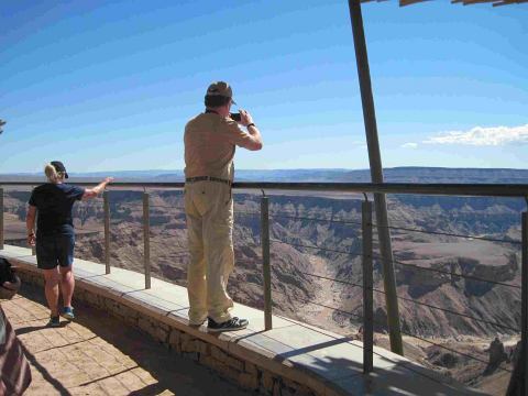 Am Freitag, 3. 3., ging es um 8 Uhr zum Fish River Canyon (570 km). Das Wetter war endlich schön! Der Fish River ist der längste Fluß in Namibia (650 km) und der Fish River Canyon ist der zweitgrößte der Welt (nach dem Grand Canyon) und bis zu 550 m tief. Der Blick in die Tiefe war aufregend (Horse Shoe Felsen), der Fluß führte wenig Wasser. Immer wieder versuchen Leute, den Canyon zu durchwandern und unterschätzen die Anstrengung und die Hitze und verunglücken. Am Abend kamen wir zum Ai-Ais-Hotsprings-Resort, das wunderschön in einem Felsental liegt. Welche Farben: Blauer Himmel, gelbe Landschaft, grünes Wasser! Die Anlage ist toll, ein Thermalbecken im Freien, ein sehr großzügiges im Haus. Wir wurden freundlich empfangen, Trudy war besonders nett. Alle bekamen ein Apartment mit Balkon, Wohnraum, Schlafzimmer, Vorzimmer und Bad. Alles war liebevoll gerichtet, nach dem vorigen Hotel waren wir direkt gerührt von soviel Annehmlichkeiten. Das Restaurant war halb im Freien, wir aßen vorzüglich (Oryx-Steak). Schade, daß wir nur eine Nacht bleiben konnten! (Siehe Hotel-Webseite)