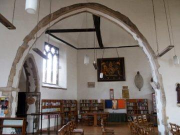 3schiffiges Inneres mit interessantem Gewölbe, Bibliotheksecke in der Kirche.