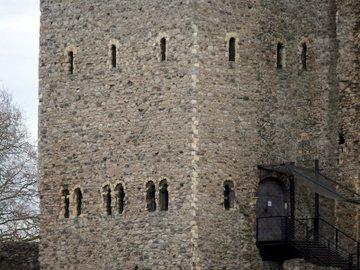 Rochester Castle (ab 1087) mit mächtigem Bergfried auf einem Hügel