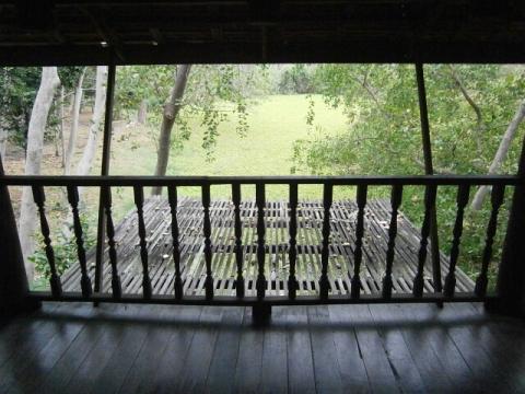 Balkon von Haus 2, Blick auf Haus 1, dazwischen der Sternfrucht-Baum.